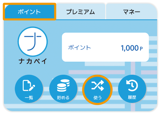 ❶お会計の際にナカペイを開いて[使う]をタップ